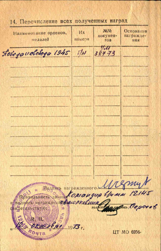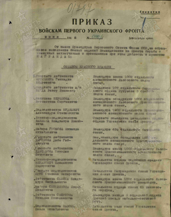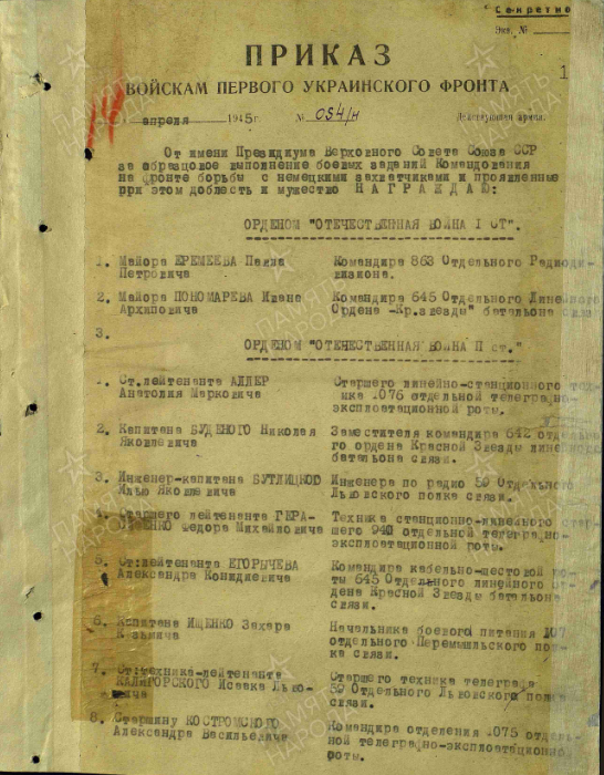 «... Работая старшим техником телеграфа на узле связи 1 Украинского фронта, в период наступления войск фронта в районе Берлин, благодаря отличной работе, правильно организованной эксплуатации комплектов БОДО, своевременному профилактическом ремонту и тельному уходу со стороны подчиненных ему техников и механиков БОДО, добился бесперебойной работы комплектов, чем самым способствовал организации бесперебойной связи командованию штаба фронта с армиями и корпусами».