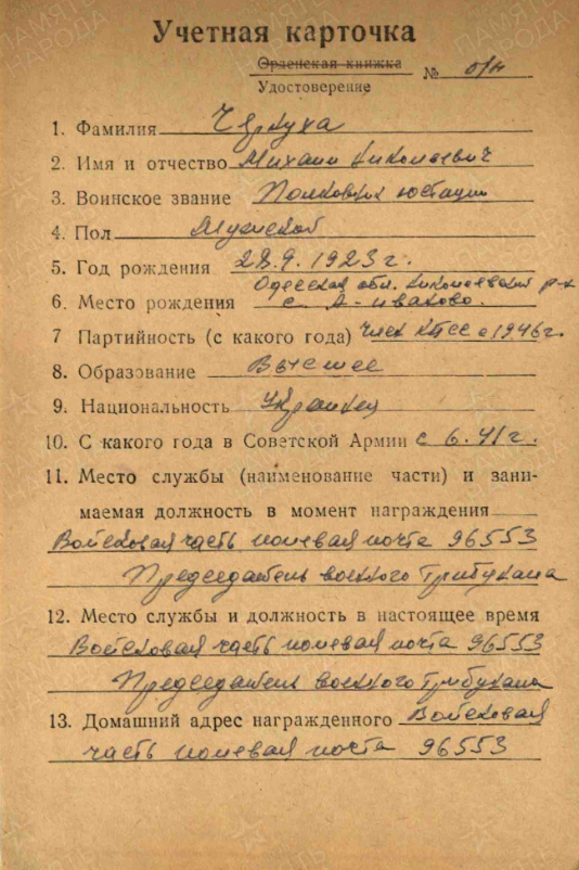 Подполковник юстиции Чернуха Михаил Приказом № 054/н от 14 апреля 1945 г. награжден медалью «За боевые заслуги».