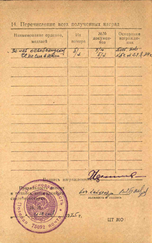 29 августа 1974 г. постановлением Центрального комитета Коммунистической партии Чехословакии награжден медалью «30 лет освобождения Чехословакии Советскими войсками».