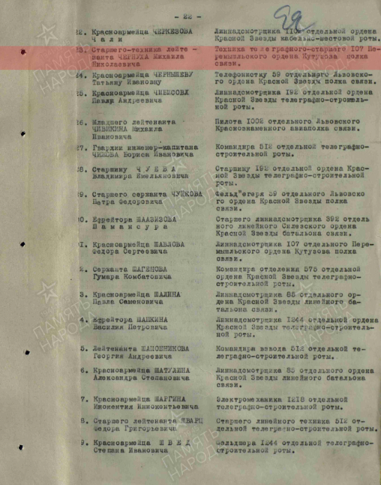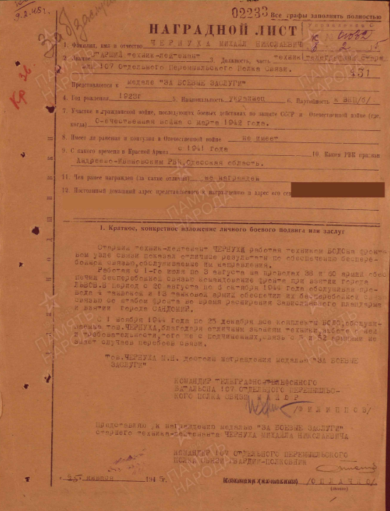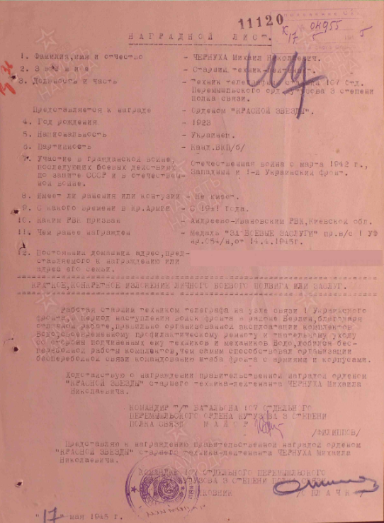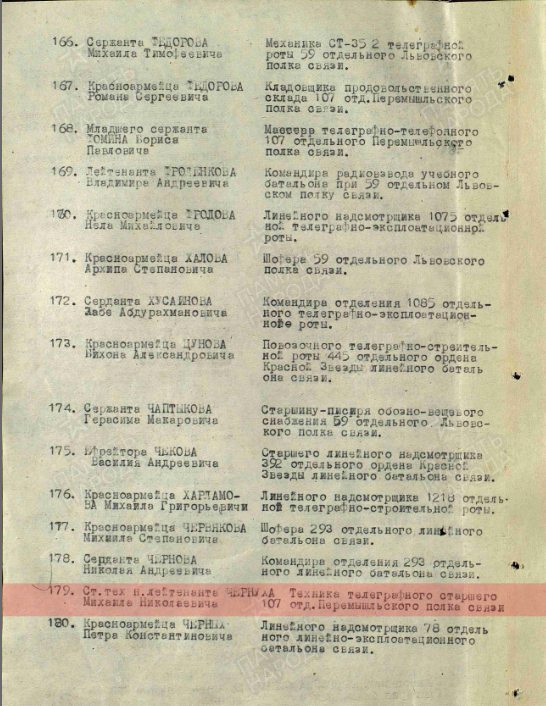 «... Старший техник-лейтенант Чернуха работая техником БОДО на фронтовом узле связи показал отличные результаты по обеспечению бесперебойной связью обслуживаемые им направления.